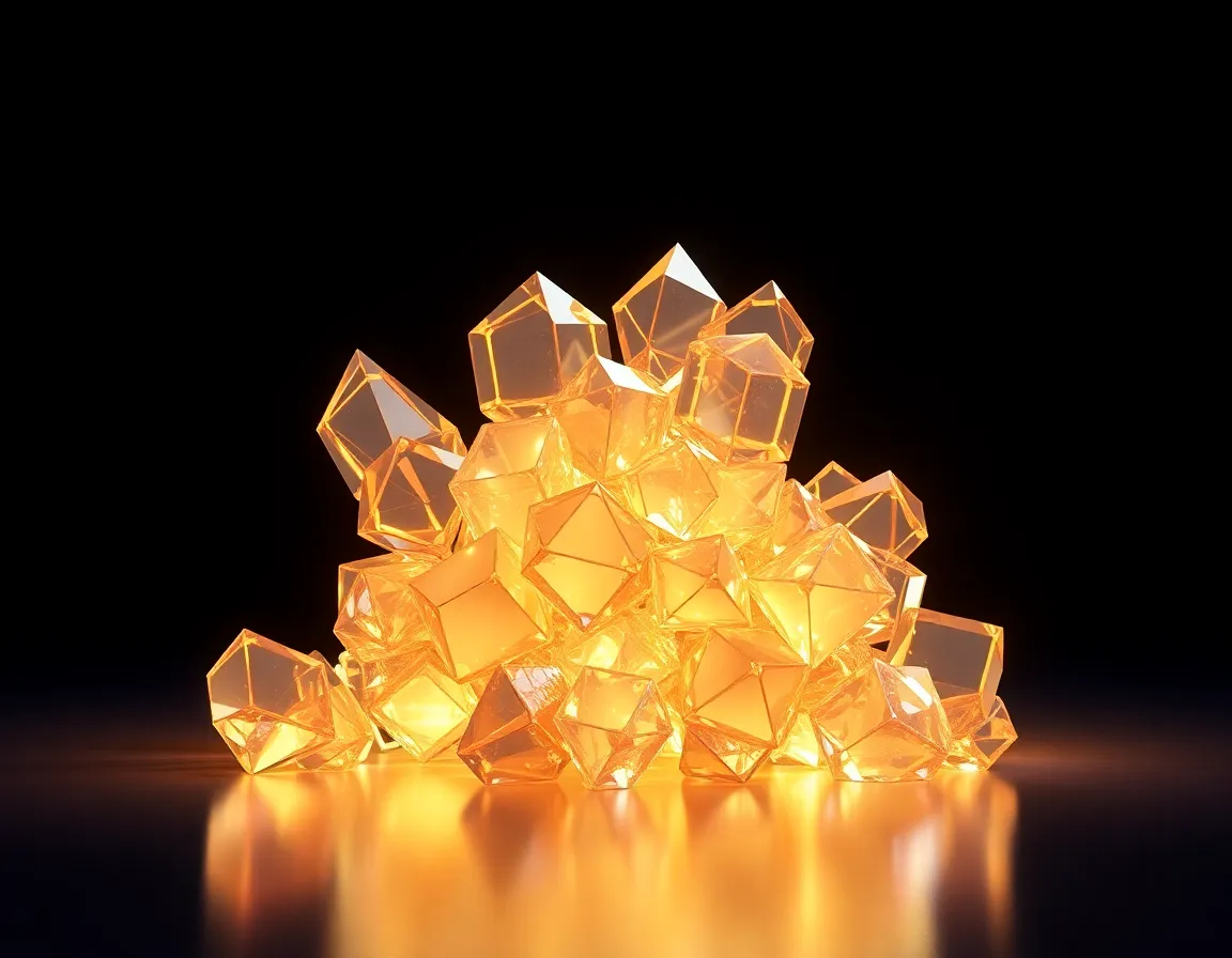 Prompt: "Geometric crystalline formations emerging from a pool of liquid gold, refracting rainbow light prisms throughout the composition, ultra-detailed 3D render with volumetric lighting and caustics"